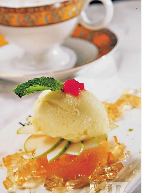 柚子雪葩配香橙糕︰分成 5 部分,包括是草莓果肉醬、柚子雪葩、青蘋果片、香橙奶凍 Panna Cotta,旁配 Choya 梅酒果凍粒,每部分都很原味而清爽。